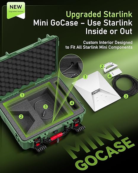 Starlink Mini IP67 Waterproof Hard Carrying Case. Keep your Starlink Mini and essential accessories running without ever opening the case. The built-in waterproof DC female port lets you plug into a power station or battery from the outside which is perfect for rain, dust or windy conditions. This carry-and-go hard case design is the core idea behind the GoCase concept: a field-ready protective case built to keep your Starlink Mini online wherever you take it.